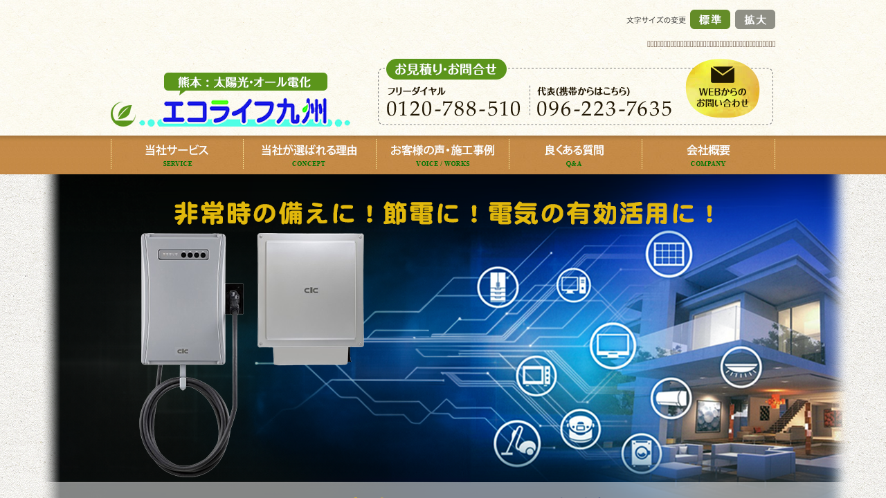 エコライフ九州株式会社エコライフ九州株式会社は、熊本県を中心に九州全域で、太陽光発電システムや蓄電システム、オール電化に関わる製品などの提案・販売・施工を行っている会社です。