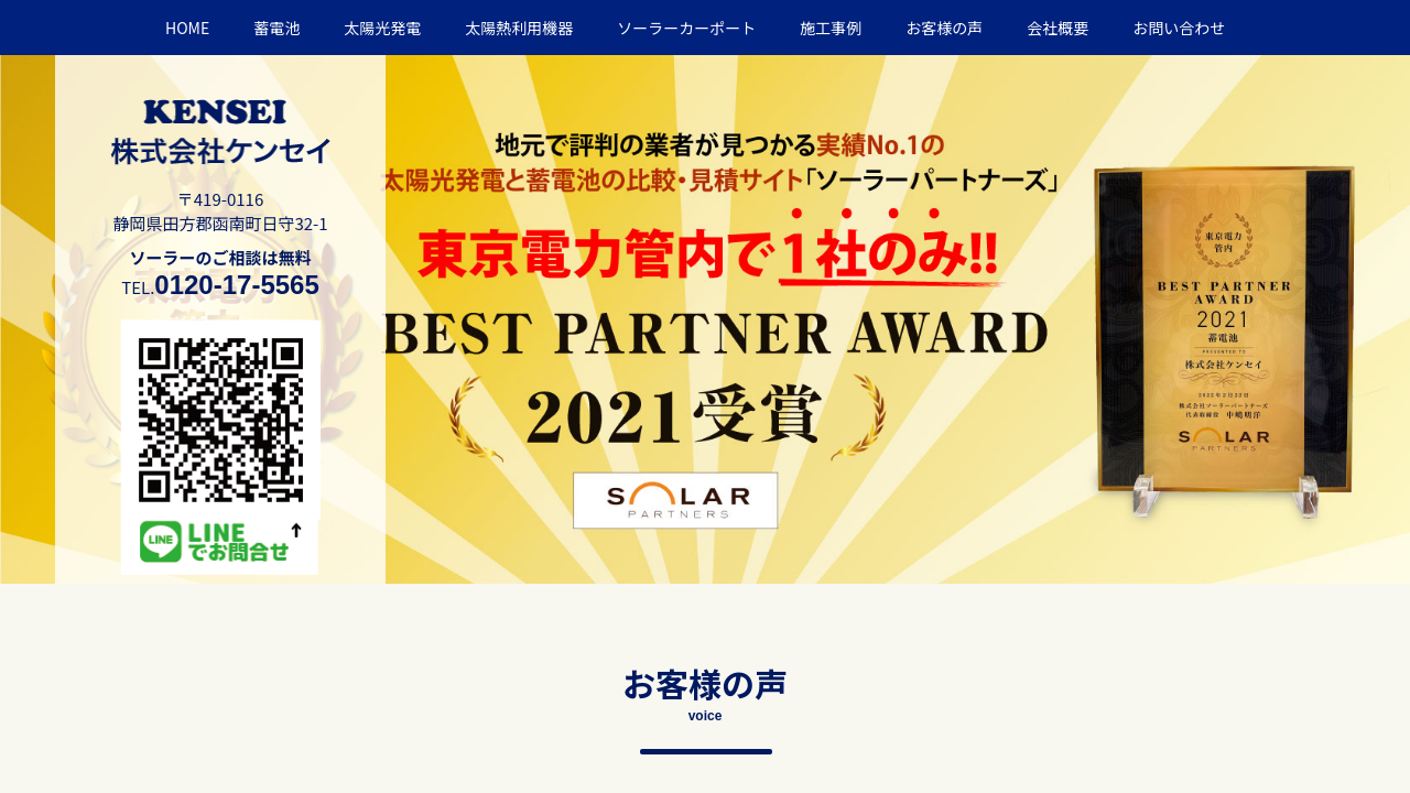 株式会社ケンセイ株式会社ケンセイは、静岡県田方郡函南町を拠点とする、太陽光発電や蓄電池システムの専門会社です。