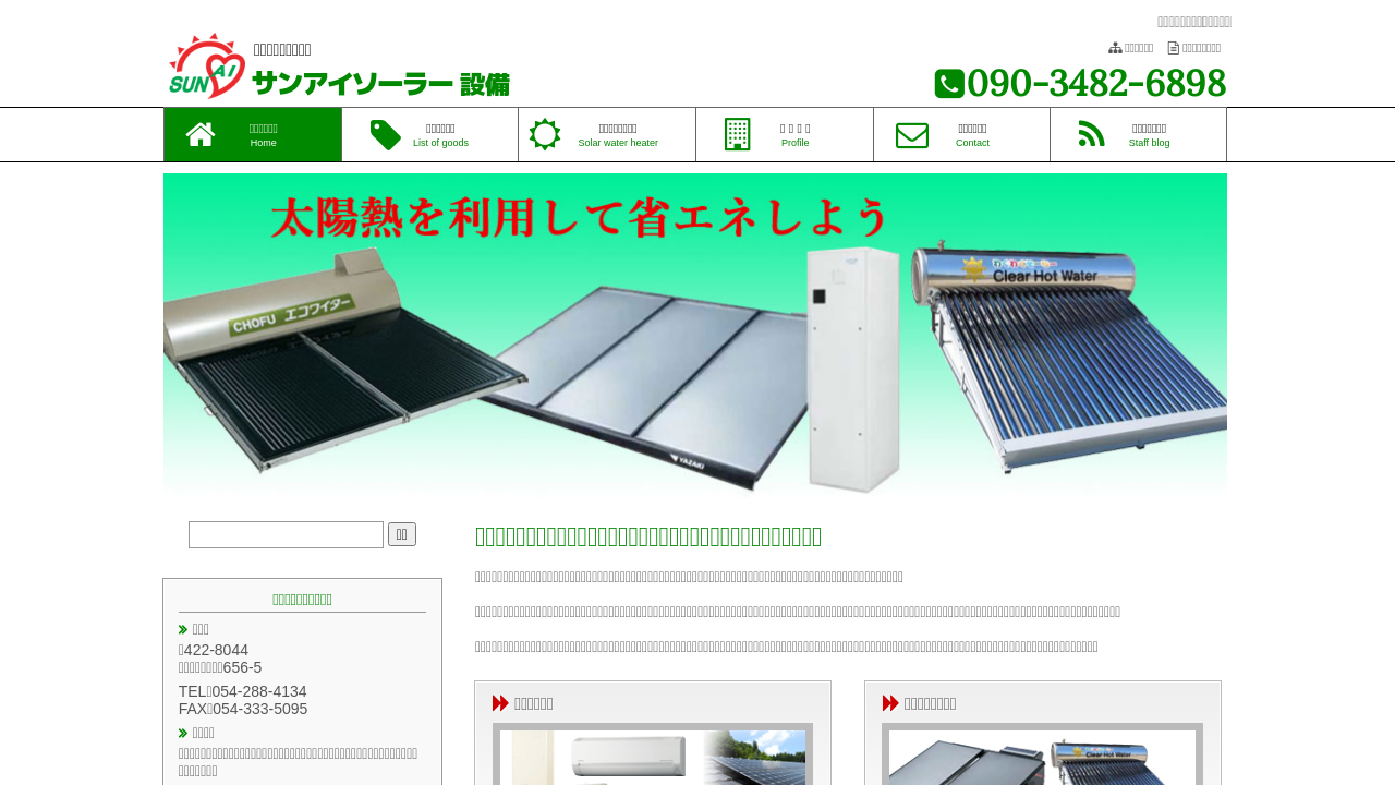 サンアイソーラー設備サンアイソーラー設備は、静岡市を拠点に、太陽熱温水器、太陽光発電、給湯器、エコキュート、ビルトインガスコンロ、エアコンなどの住宅設備の施工販売を長年行っている会社です。