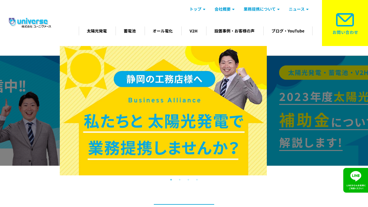株式会社ユーニヴァース株式会社ユーニヴァースは、太陽光発電、蓄電池、オール電化、V2Hの販売・施工を行う会社です。