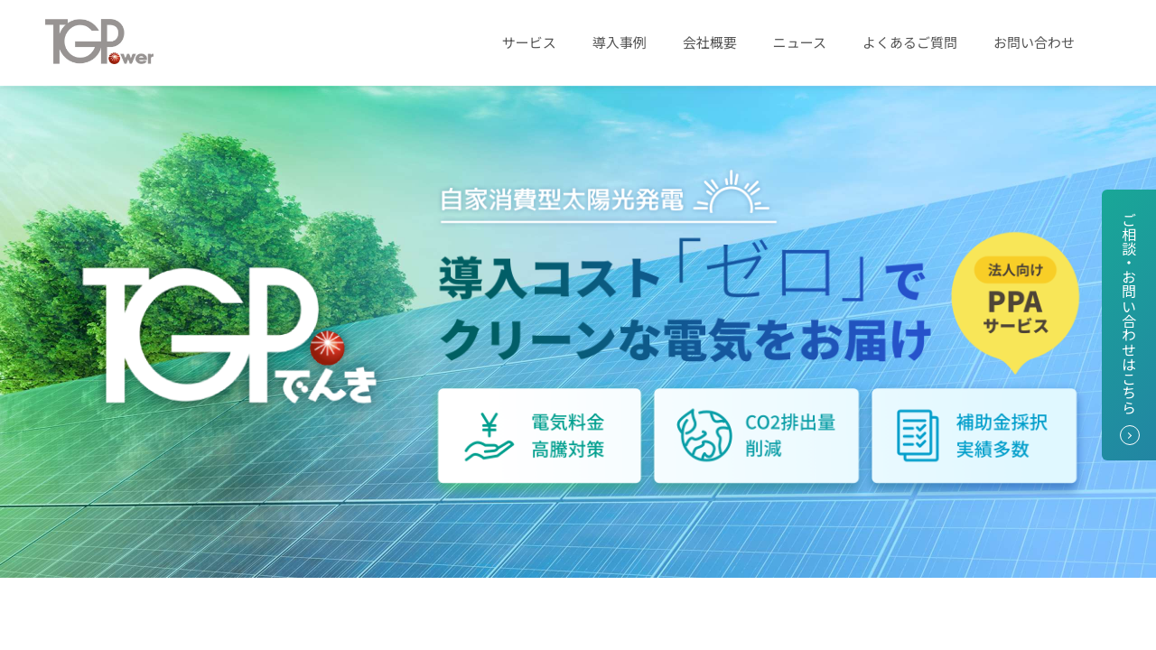 株式会社TGパワー株式会社TGパワーは、初期費用・保守費用ゼロで太陽光発電設備の導入を可能にする法人向けPPAサービス「TGPでんき」を提供している企業です。
