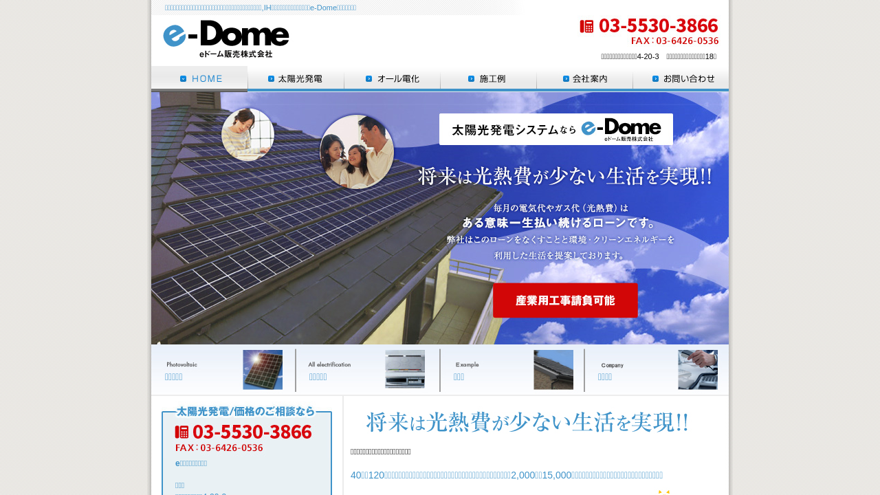 eドーム販売株式会社は、東京都・埼玉県を中心に、太陽光発電とオール電化の施工を手掛ける会社です。光熱費の削減と売電収入による経済的なメリットを、お客様に提供しています。