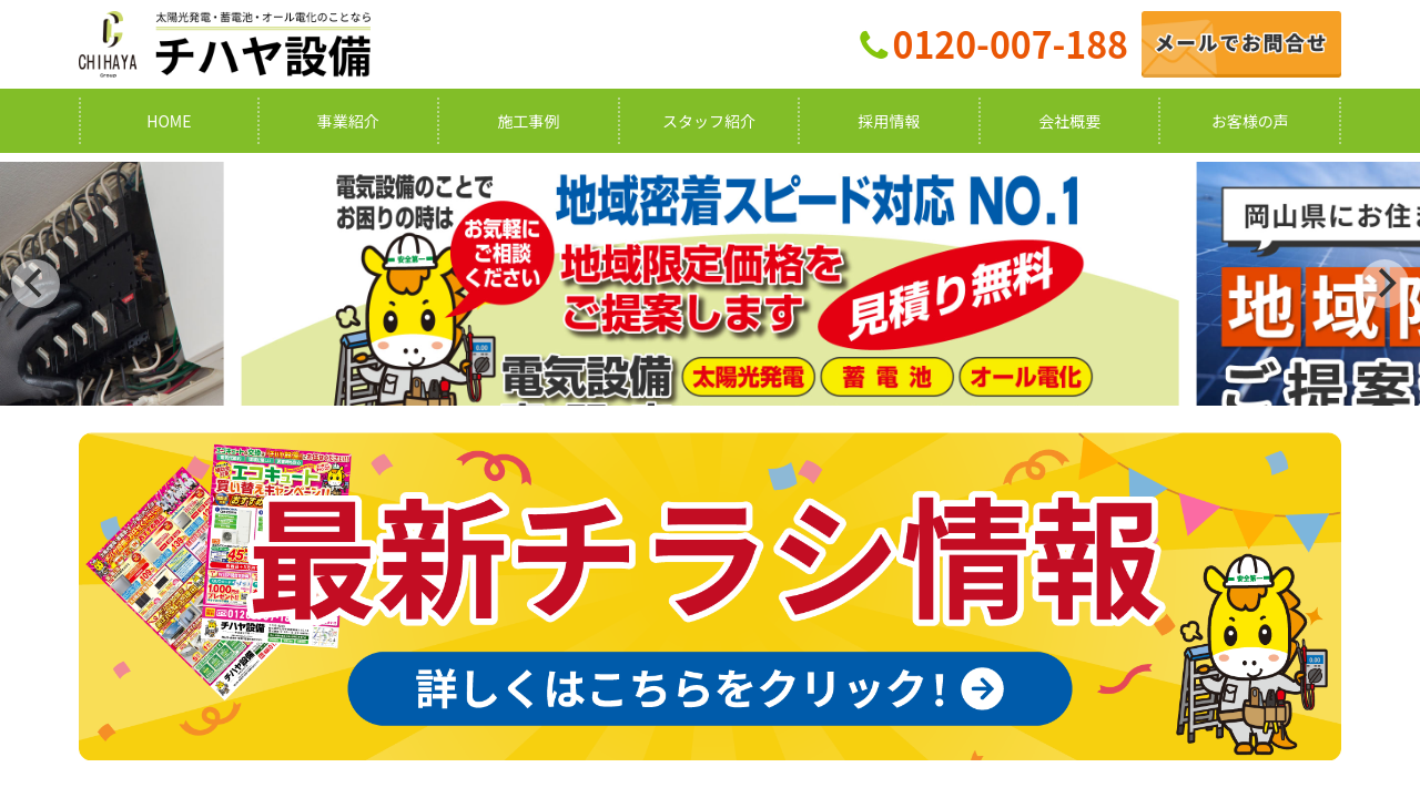 株式会社千隼(チハヤ設備)株式会社千隼(チハヤ設備)は、岡山県を中心に、電気工事・設備工事を行う地域密着型の会社です。