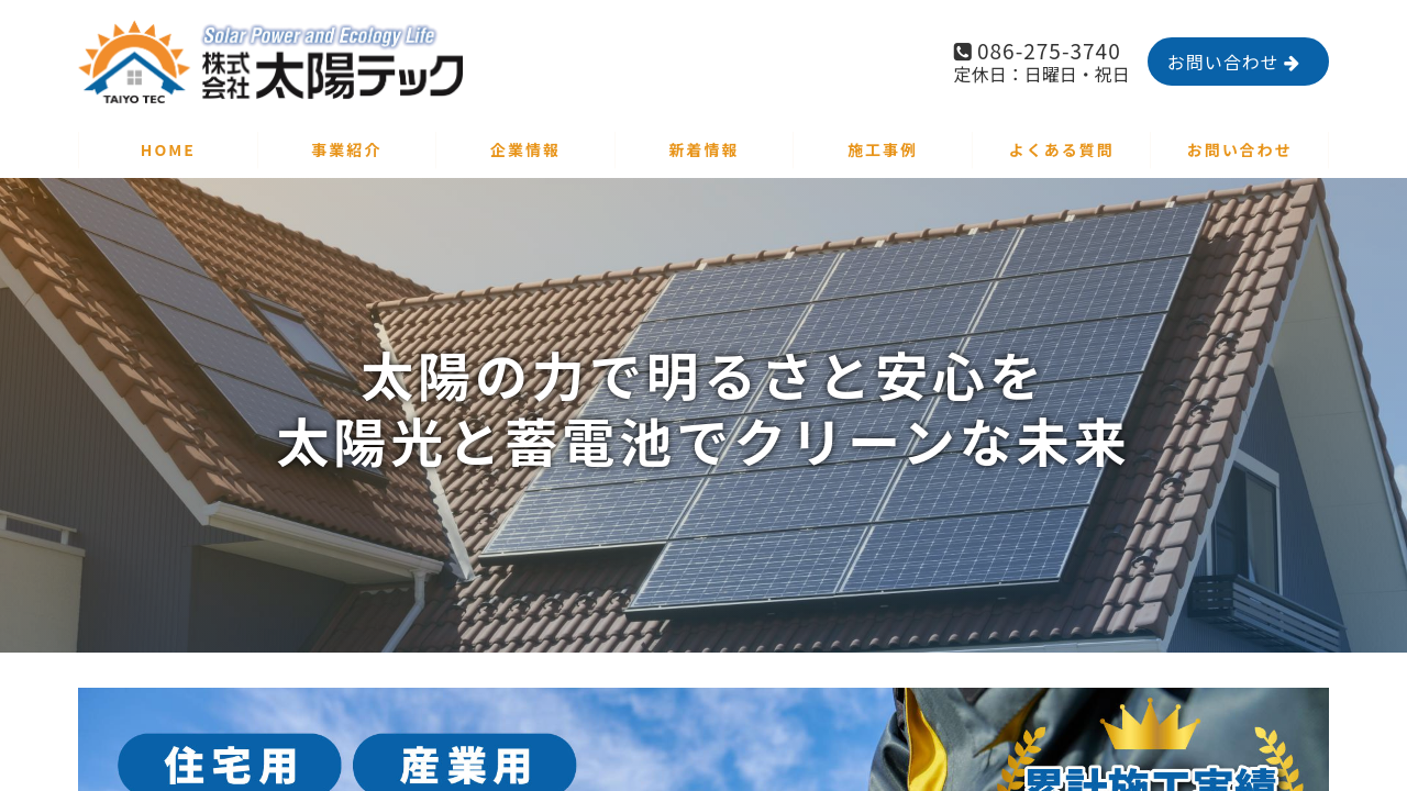 株式会社 太陽テック株式会社 太陽テックは、岡山県岡山市を拠点とする、太陽光発電システム、蓄電池、リフォーム、住宅設備機器(オール電化)を専門とする会社です。