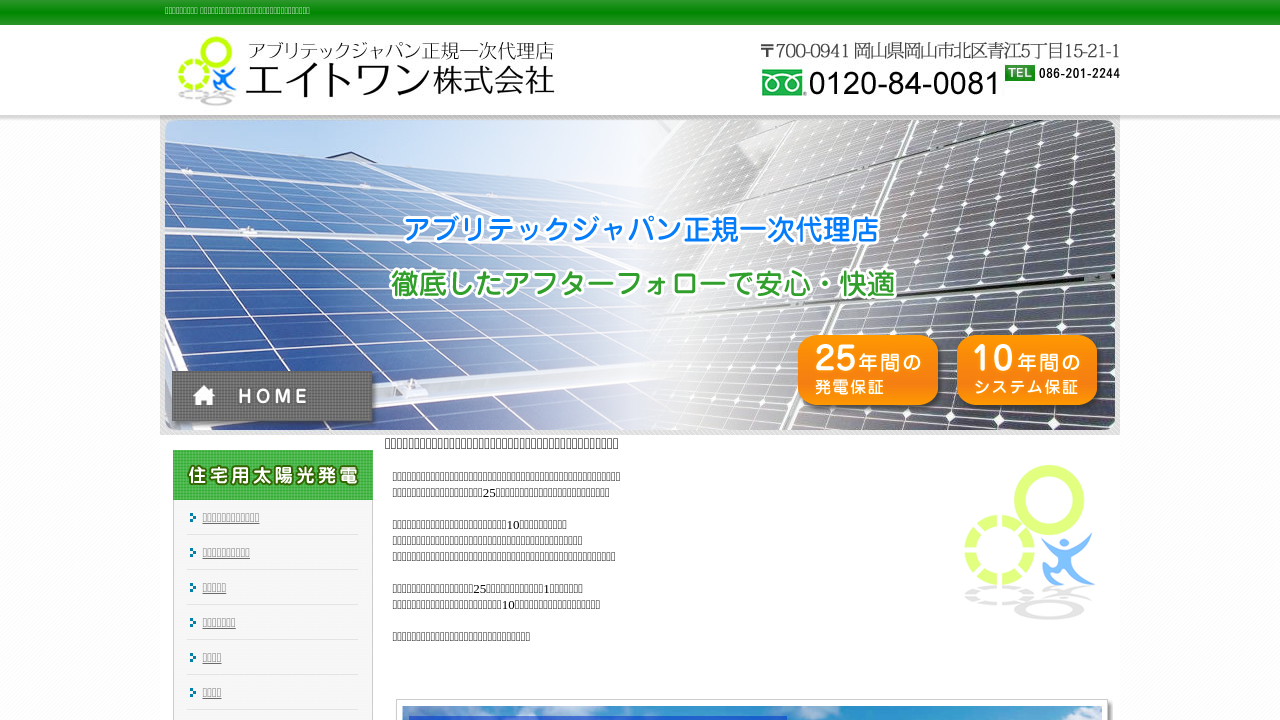エイトワン株式会社エイトワン株式会社は、岡山県岡山市に拠点を置く、住宅用・産業用の太陽光発電システムの販売・施工を行う会社です。