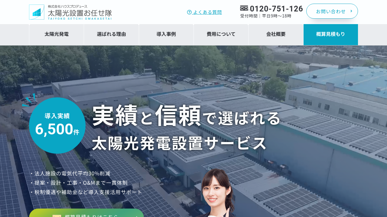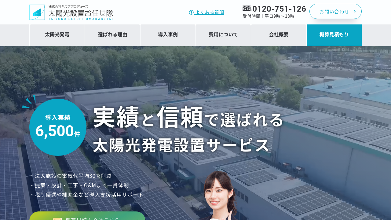 太陽光設置お任せ隊(株式会社ハウスプロデュース)太陽光設置お任せ隊(株式会社ハウスプロデュース)は、6,500件の実績を誇る、太陽光発電設置のプロ集団です。