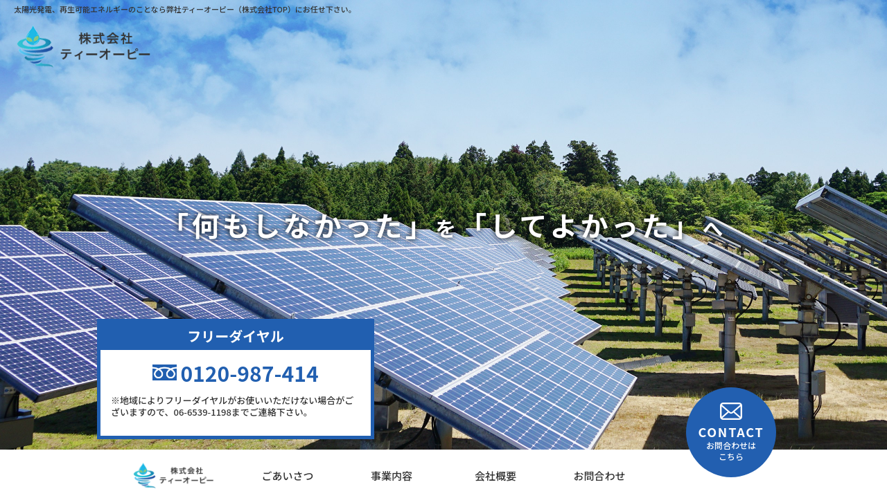 株式会社TOP(ティーオーピー)株式会社TOP(ティーオーピー)は、再生可能エネルギー事業を展開する会社です。